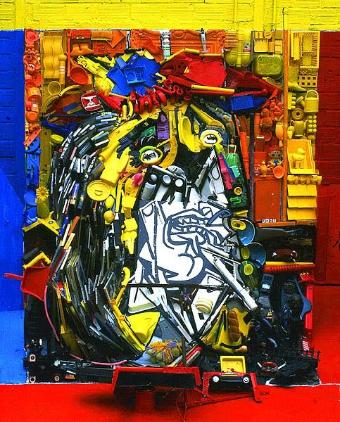Pues bien cuando el collage se vuelve tridimensional hablamos de assemblage. Es un proceso de construcción escultórica que consiste en ir pegando unos objetos con otros para crear otro nuevo.