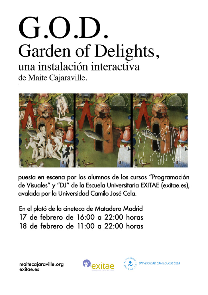 Los días 17 y 18 de Febrero en el plató de la Cineteca de Matadero de Madrid Maite Cajaraville presentó una instalación interactiva titulada «GOD, Garden of Delights». Un espectáculo audiovisual en el que el público que asistió era la parte fundamental del evento