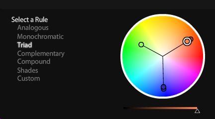 - O puedes crear la paleta directamente por colores desde la rueda de color estableciendo varios criterios para la paleta como: colores complementarios, triadas, colores análogos, colores monocromos etc: