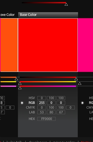 - En cada selección que hagas, te permite subir y bajar la luminosidad o la saturación con unos cursores triangulares y ver el cambio directamente. Puedes ver también los valores del color elegido en diferentes sistemas de color: CMKY, RGB, LAB y HSV. Si trabajas en html para una web puedes coger los valores hexadecimales.