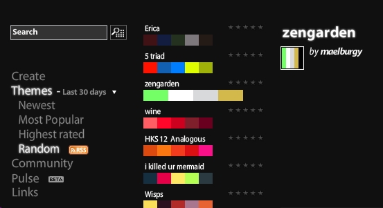 Ayer un amigo me enseñó una web super interesante para nuestra materia. Se trata de KULER. Es una aplicación creada por los laboratorio de Adove para generar paletas de color.